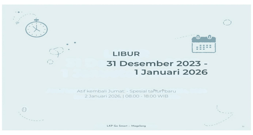 Dalam rangka menyambut pergantian tahun, kami sampaikan kepada seluruh peserta kursus, orang tua, dan mitra bahwa LKP Go Smart menetapkan jadwal libur sementara sebagai berikut: